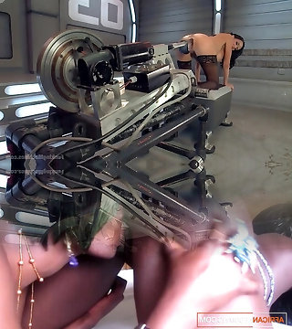 While being fucked with fucky-fucky machine insane brunette gives BJs to masters
