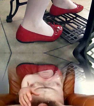 Pretty black-haired chick Petra wears red flats while working with sewing machine