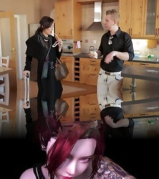 巨大的胸部towheaded若虫在红色,缎子半衬衫,莎朗*罗西得到了porked从后面,而站在